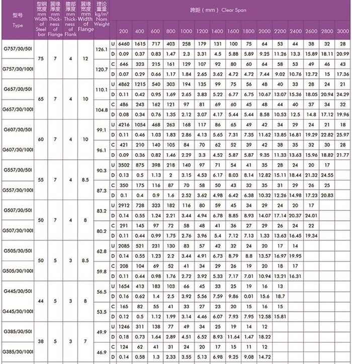 工字型扁鋼中心距為30常用格柵板規格型號及安全荷載表
